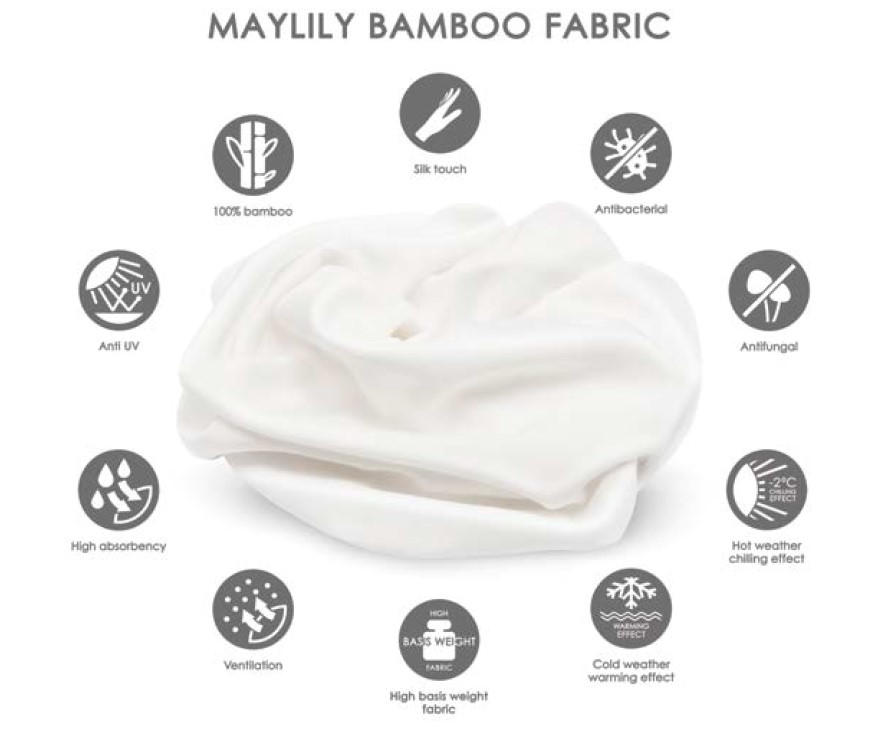 Τα υφάσματα Maylily Bamboo έχουν μεταξένια υφή. Είναι αντιβακτηριακά, αντιμυκητιακά με προστασία UV και ισοθερμικές ιδιότητες (δροσιά στο ζεστό καιρό / ζεστασιά στον κρύο καιρό), υψηλής αντοχής & απορροφητικότητας.